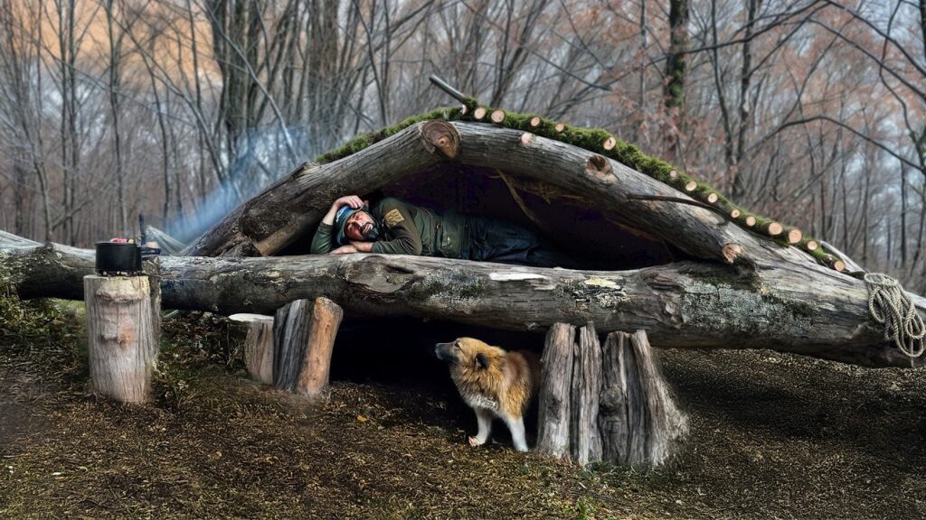 Nestled beneath a colossal fallen log, my moss-roofed shelter exhales quiet resilience. Raindrops patter softly on the thick, emerald carpet overhead, sealing me in a damp, earthy cathedral. Below, dry duff cradles my sleeping pad—the log’s immense bulk shielding me from wind and prying eyes. At its base, the heart of camp glows: a Swedish torch, its split-log core burning steadily inward. Perched atop, a small pot simmers—a simple stew of foraged greens, dried venison, and wild onions, its aroma weaving with woodsmoke. Utterly alone, yet profoundly held by the forest, I sip broth, warmed by fire and self-reliance.