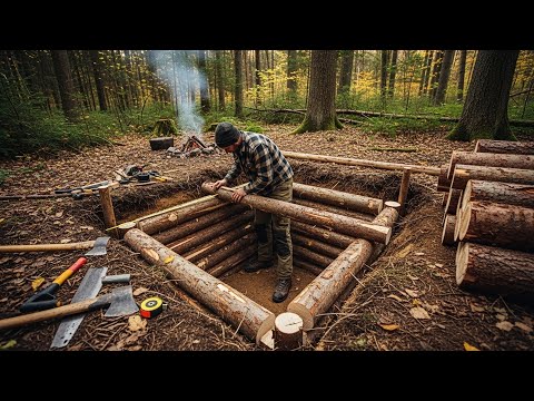Building an Underground Log Cabin Shelter | Survival in the Forest