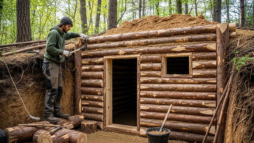 Today, I sealed the front wall of my underground log cabin shelter—a major milestone. After days of hauling and notching logs, I carefully fitted the final timber into place, chinking gaps with a mix of clay, moss, and wood ash for insulation and weatherproofing. Reinforcing the structure with vertical stakes and earth berming ensures stability against soil pressure. The heavy wooden door, hinged with salvaged iron, now swings shut with a solid thud, promising security and warmth. Rain held off just long enough to finish the roof overhang. Standing back, muddy and exhausted, I felt a deep sense of accomplishment—my sanctuary is nearly complete, ready to shield me from whatever comes next.