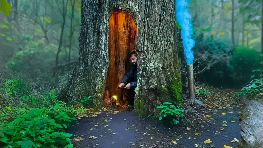Tucked within the hollow heart of an ancient oak, my bushcraft dugout offers sanctuary from wind and rain. I carved a low entrance just wide enough to crawl through, preserving the tree’s living bark for camouflage and strength. Inside, I lined the floor with dry ferns and layered pine boughs for insulation. A small, carefully shielded fire pit near the entrance provides warmth and a place to boil water, its smoke venting through a natural crack in the trunk. Felled branches and moss seal gaps, while a woven reed mat adds comfort. Hidden, dry, and surprisingly snug—it’s the perfect survival retreat.