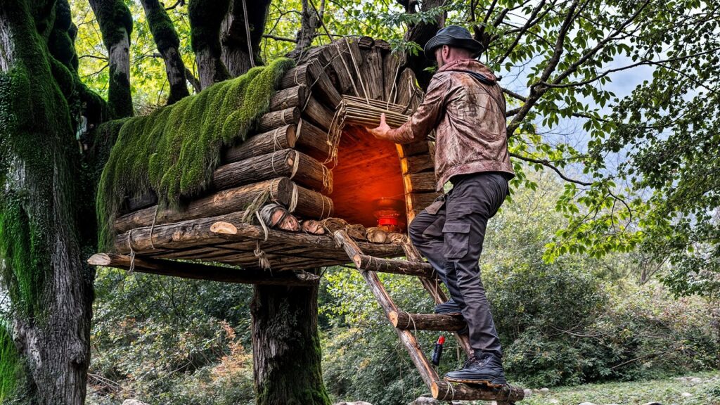 Nestled high among ancient branches, this rustic treehouse shelter defies modern construction—crafted solely from interwoven logs and sturdy rope. No nails, no metal, just raw timber lashed together with time-honored knots, forming a secure platform suspended in the canopy. Weathered logs create walls and a slanted roof, offering shelter from rain and wind, while thick ropes anchor it firmly to the living trunks. Accessed by a rope ladder swaying gently in the breeze, it’s a testament to simplicity and harmony with nature. Here, amidst rustling leaves and birdsong, one finds solitude, adventure, and the quiet strength of wilderness ingenuity.